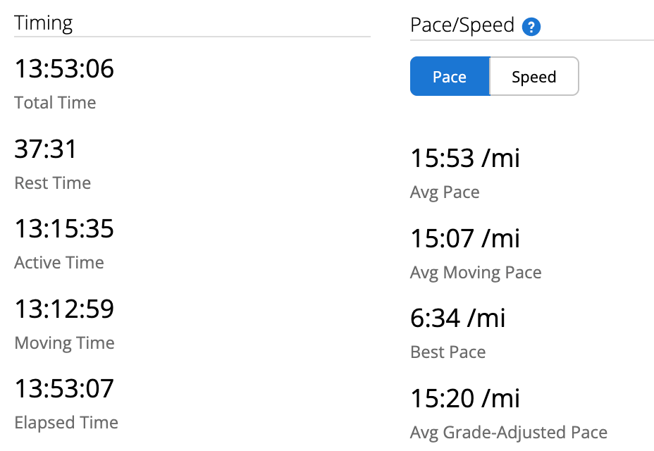So I switched to primarily UCAN gels and Cheez-Its for my fueling, as they contain carbs but no sugar. It didn’t really work. I still had the same sensation and had to make an emergency pit stop around midday. Waking up at 3AM and trying to eat early enough to… get things out of the way… before starting the race was also a challenge – one that I obviously failed. I also tried taking Imodium, which I think may have only made things worse. Nearly all of the 37 minutes of “rest” time logged was in the “rest room.”